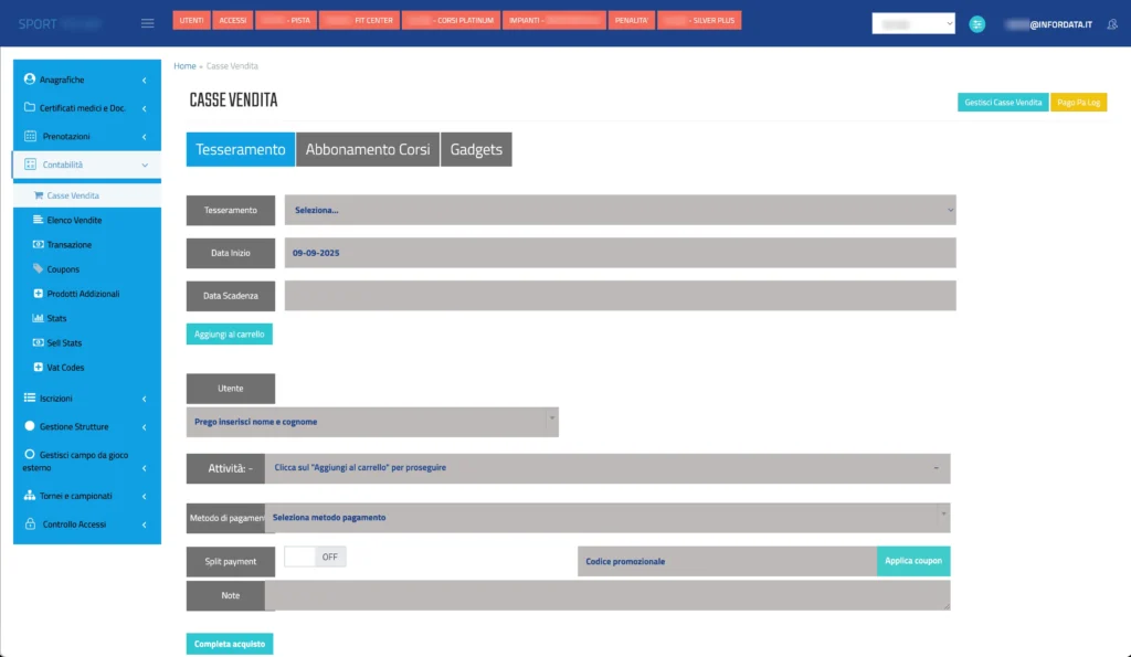 - gestione di abbonamenti, tesseramenti e pacchetti personalizzati