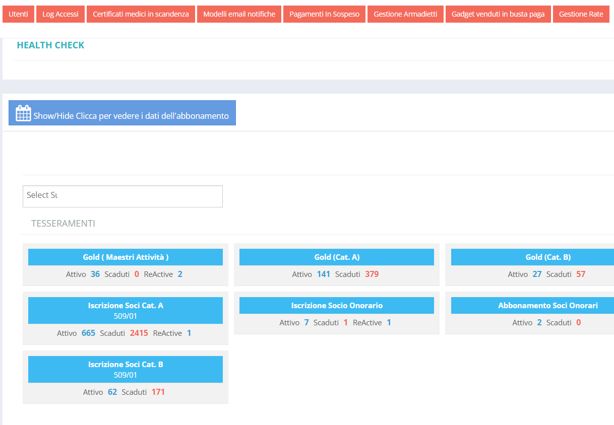 tutti i tesseramenti e abbonamenti dei clienti,